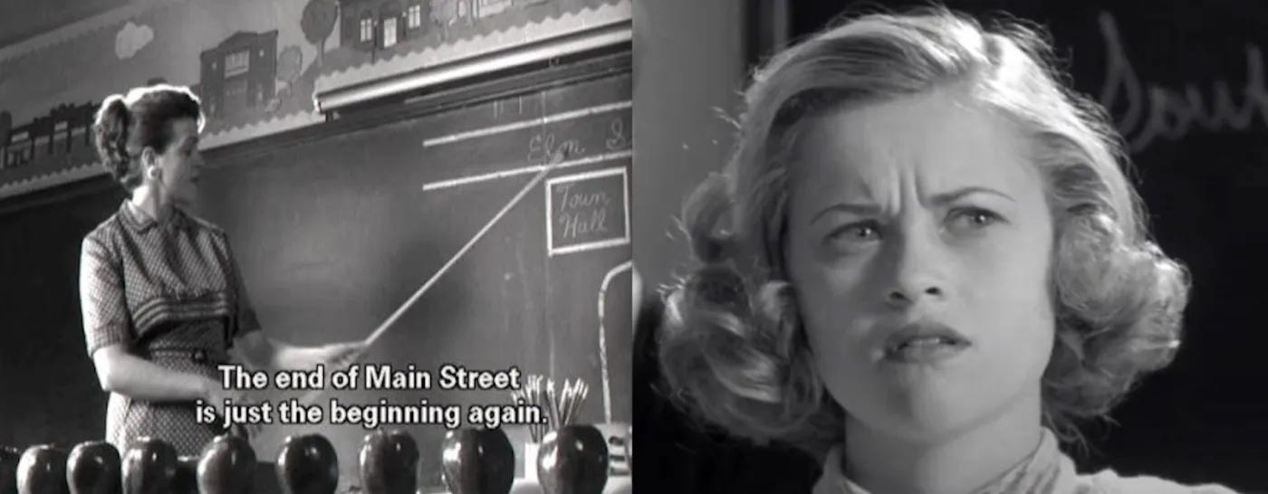 This kind of returning is like Main Street in Pleasantville. The end is the beginning, the loop is as small as it could possibly be. When new things start to happen (sex and reading), color returns to the black and white town—something new it seems, and yet always the way it really was. Main Street opens up to the big loop of the world.