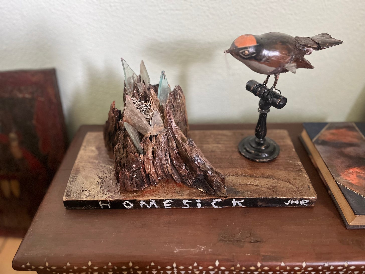 My incredible and extremely cool mother, a professional artist and painter, put her brushes aside and started writing hilarious stories several years ago; she doesn’t feel pressure or sadness around not painting anymore—there’s too much to be excited about, coming around this long loop to begin again. My father, a career writer, has returned to beginner’s mind through sculpture, where he’s finding experimentation and fun that he admitted writing hadn’t been providing much of anymore. And he’s amazing at it. Check out what he made for me for my birthday this year, with old wood, sea glass and live oak.